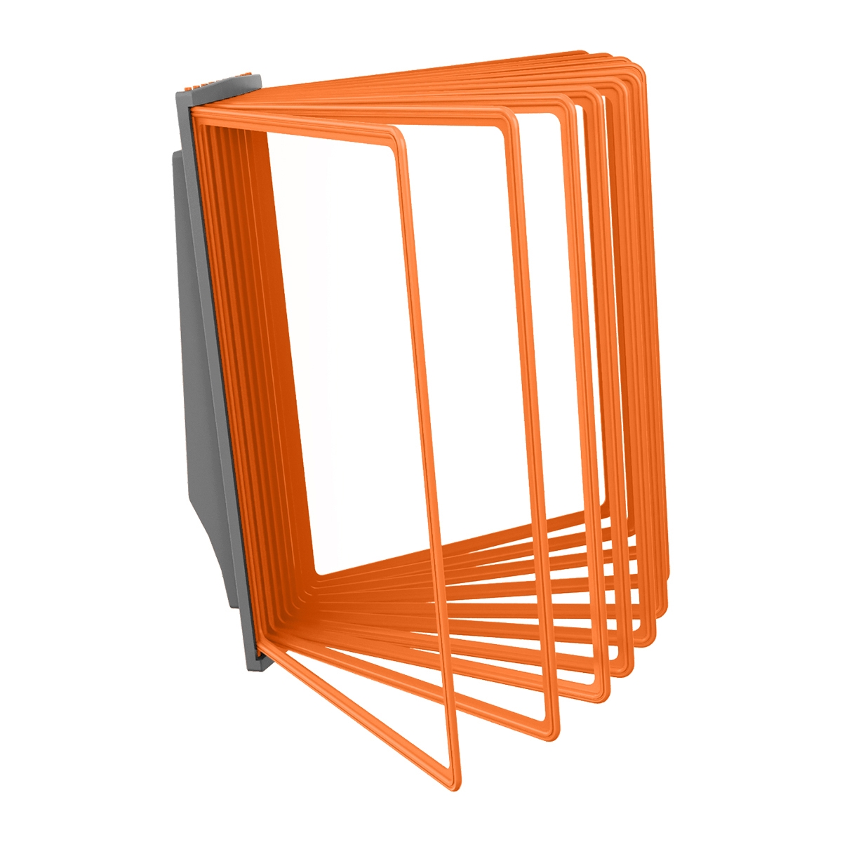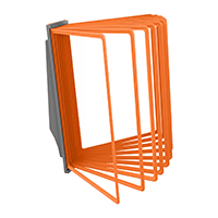 Настенная демосистема сочного оранжевого цвета. Для привлечения внимания покупателей к горячим акциям и предложениям, о которых они могли бы так и не узнать. Закрепите на стене модуль из 10-ти файлов, затем вставьте файлы в модуль. Разложите бумаги, которых обычно бывает много, по 10 съемным секциям в зависимости от темы.