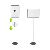 Рамка работает на две стороны, ее положение можно менять из вертикального в горизонтальное и обратно. Высоту фиксируйте с помощью телескопической трубки от 600 до 1000 мм. Вместо постера можно использовать меловую доску для надписей маркерами и мелками (приобретите дополнительно).