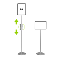 Рамка работает на две стороны, ее положение по желанию меняйте из вертикального в горизонтальное и обратно. Высоту фиксируйте с помощью телескопической трубки. от 600 до 1000 мм. Для надписей маркерами и мелками используйте меловое поле Пикча (приобретите дополнительно).