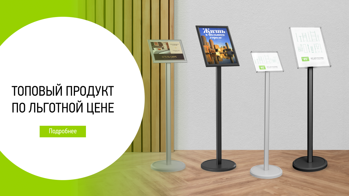 Участвуют информационные стойки Рандеву с акриловой и клик-рамкой в двух популярных форматах А4 и А3, в сером и черном цвете.